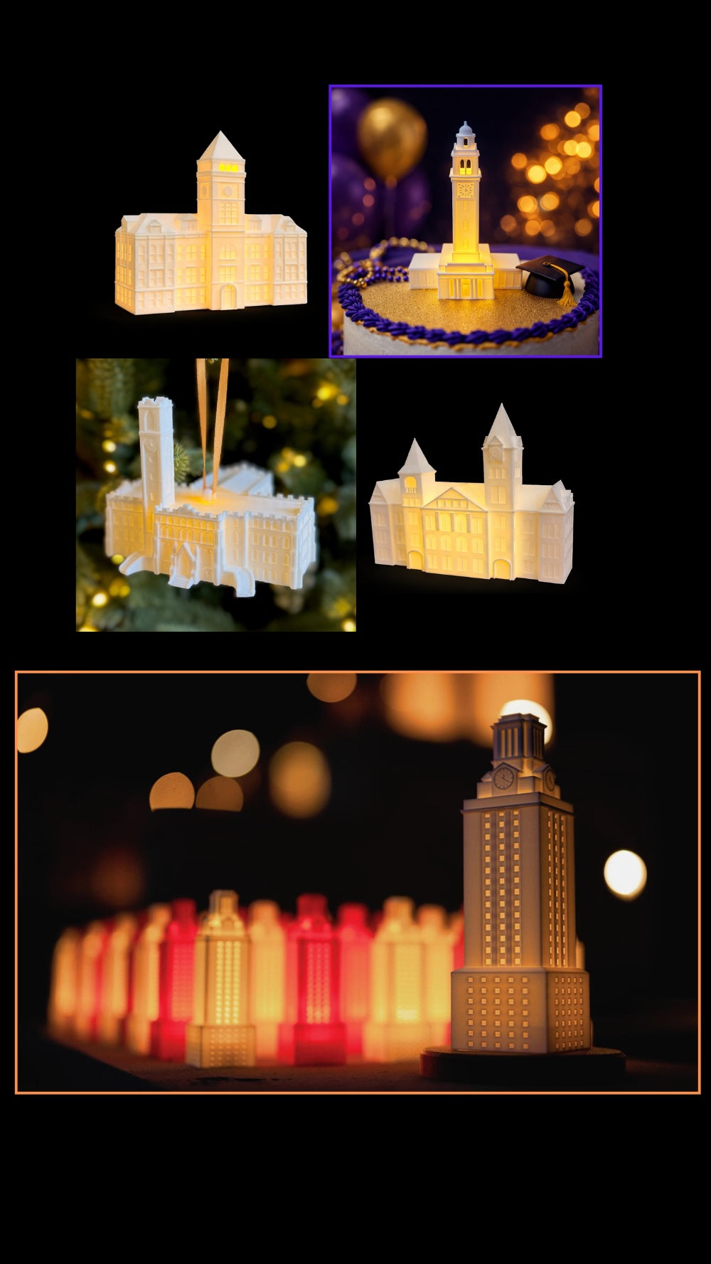 GS Three Dimensional creates 3D-printed, lighted replicas of iconic university buildings, designed as meaningful graduation gifts, alumni keepsakes, and statement decor. Each piece captures the tradition, pride, and memories that make college life unforgettable.